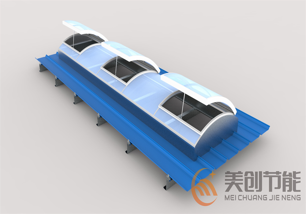 圆拱顶开天窗顶部开启扇为圆拱形,夏季有利于排水,冬季不易积雪。天窗可为任意长度,一般不小于3m,顶面设计采光板适用于日常采光,电动顶开后可作为平时