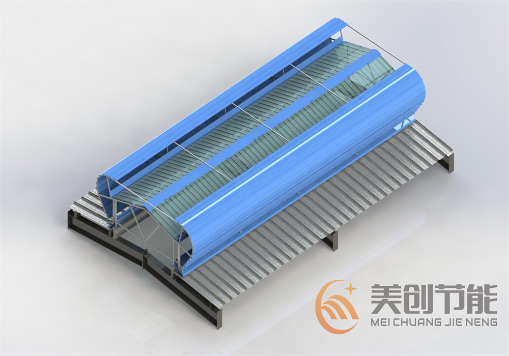 圆弧外观,其结构简单合理,侧面设计成圆弧形,有效减少风压阻力,由骨架、外围护板(挡风板)、挡雨板、排水槽、泛水板等部分组成,启闭式可加装启闭机构
